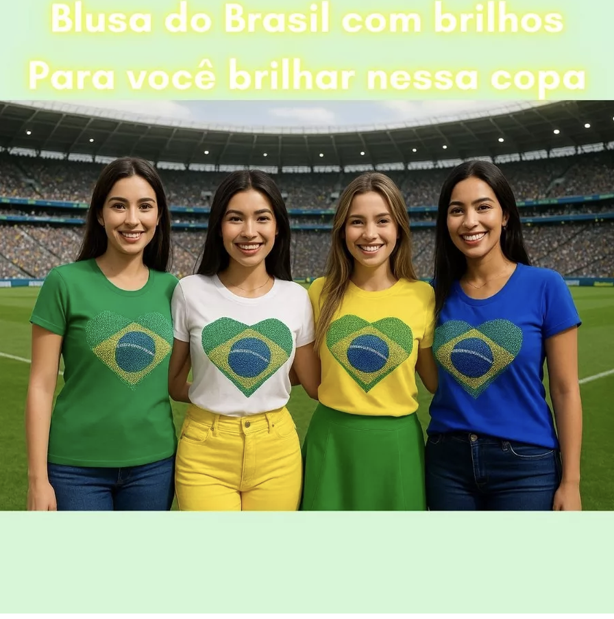 O destaque especial vai para a bandeira do Brasil em formato de coração, com aplicação em brilho, trazendo um toque delicado, moderno e patriótico à peça. Ideal para torcer com estilo, curtir festas temáticas, eventos esportivos ou compor um look casual com personalidade.