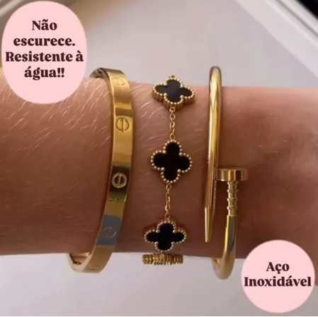 1 Bracelete prego + 1 bracelete círculos + 1 bracelete trevo (cor de sua preferência).