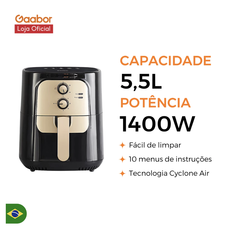 A Air Fryer Gaabor de 5,5 litros combina elegância e desempenho em um só produto. Seu design sofisticado com acabamento dourado adiciona um toque de luxo à sua cozinha. Com controle analógico de tempo e temperatura, esta Air Fryer oferece praticidade na preparação de refeições saudáveis.